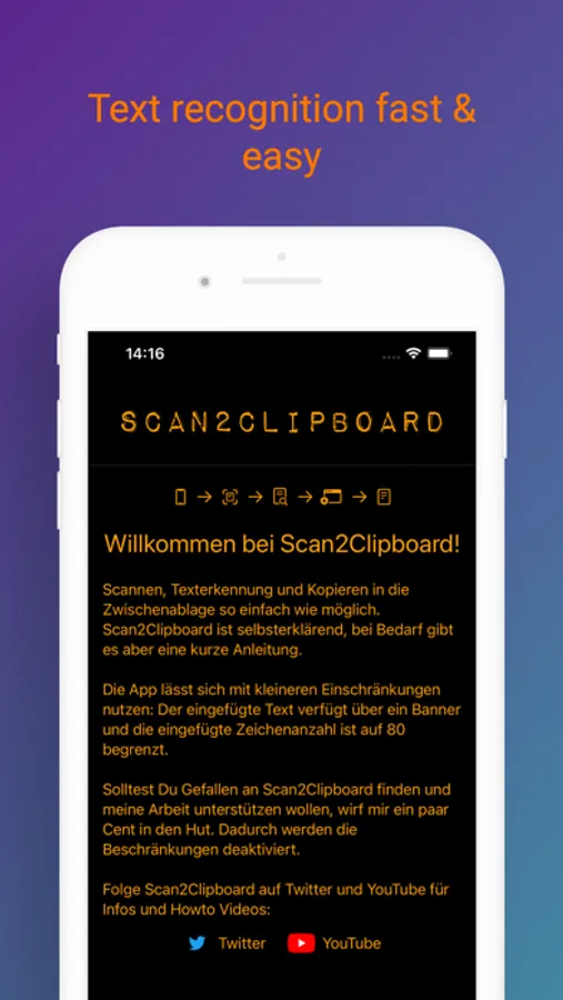 Some of the mentioned functions are only fully available after the in-app purchase. Your in-app purchase allows Scan2Clipboard to have no ads or any tracking APIs. All data is processed on your device and stays there. Fair one-time payment with family sharing instead of ongoing subscription costs.