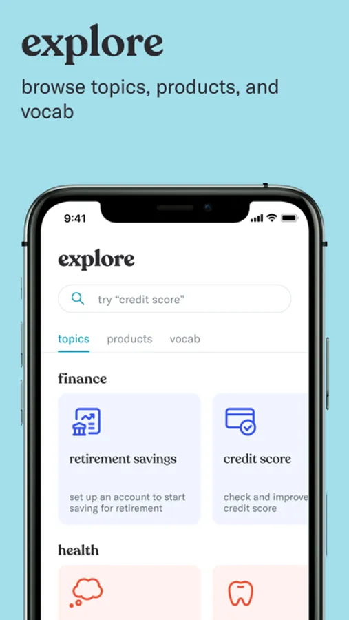 - personal finance: budgeting, checking & savings accounts, credit cards, investing, retirement savings, taxes, and student loans