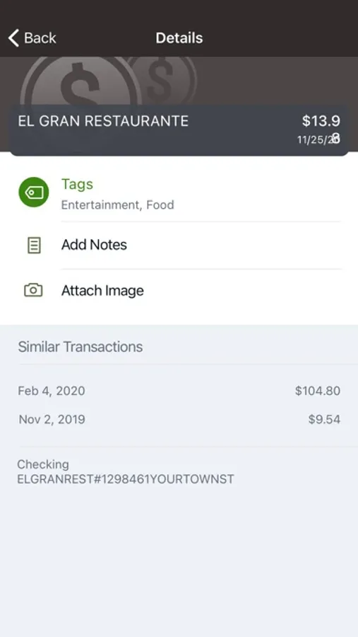 - Keep your transactions organized by allowing you to add tags, notes and photos of receipts and checks.