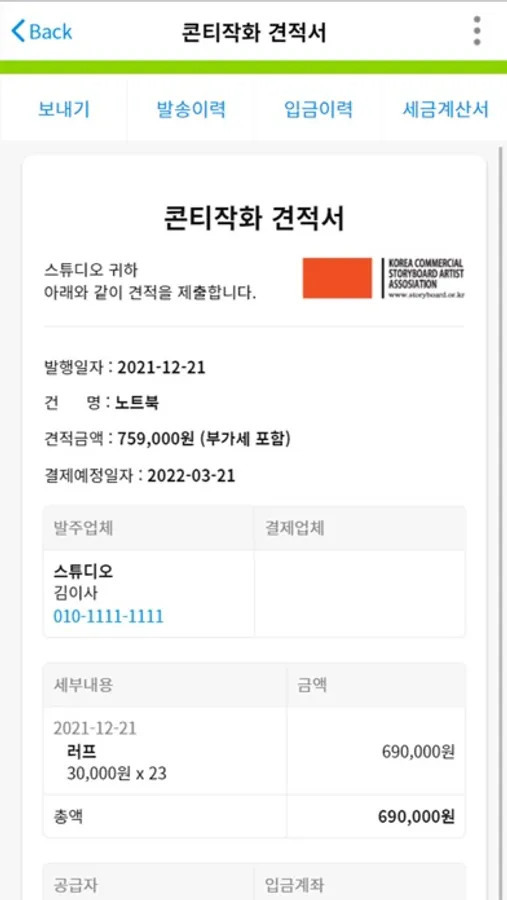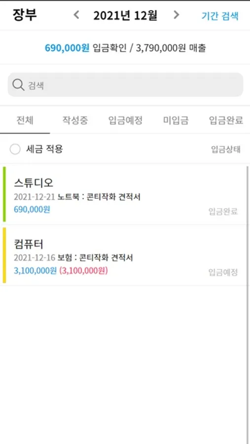 견적서 작성, 발송 여부와 월, 년 단위 수금 현황을 한눈에 볼 수 있습니다.