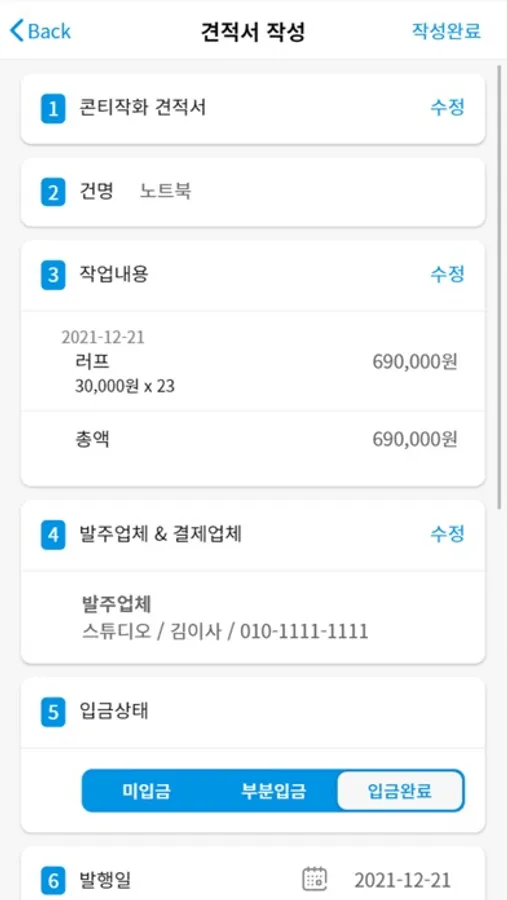 작업일정을 등록하면 한번에 견적서, 거래장부와 동기화 됩니다.