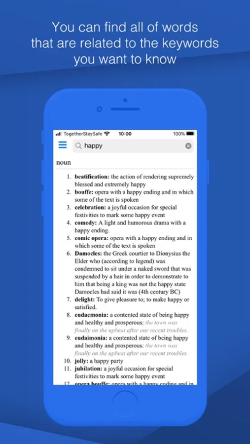 - Search for synonyms, antonyms, and particular words under categories.