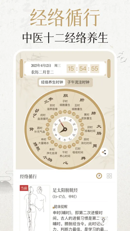 7、【经络时钟】:子午流注经络时钟,顺应人体昼夜阴阳消长、盛哀的变化,精确的中医养生建议。保持阴阳平衡,人则健康长寿!