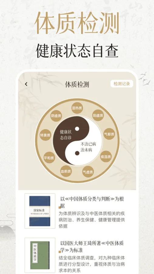 5、【体质检测】:受欢迎的中医小工具,通过人工智能技术结合中医“望、闻、问、切”进行综合分析,快速辩证,鉴定出身体健康状态并及时调理。
