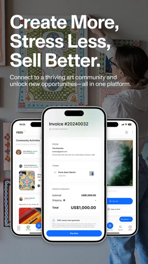 – Create a stunning, customizable portfolio that represents your artistic brand – Manage your entire art business in one place—inventory, sales, commissions, and client relationships – Process payments, generate invoices, and handle shipping logistics with ease – Build and nurture your community with integrated social features and email newsletters – Gain valuable insights with analytics to help grow your audience and sales – Access tap-to-pay for art fairs and in-person sales