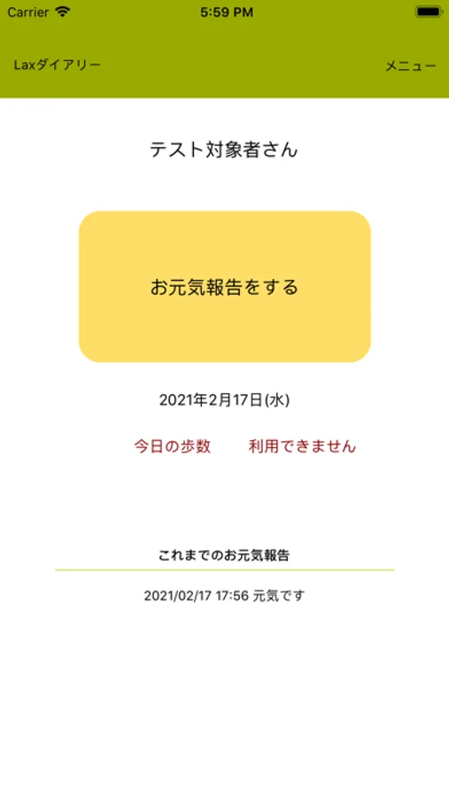 「Laxダイアリー」は、見守り・連絡サービス「Lax」( https://www.lalax.net )に登録され、見守りを受けている方が、その日の歩数や端末の電池残量、健康状態などを、サポーターに報告することができるツールです。