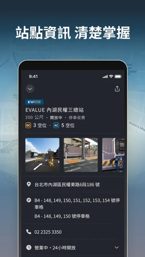 • 清楚的充電站資訊,讓你快速掌握空位、站點位置、充電停車費、現場環境等資訊。