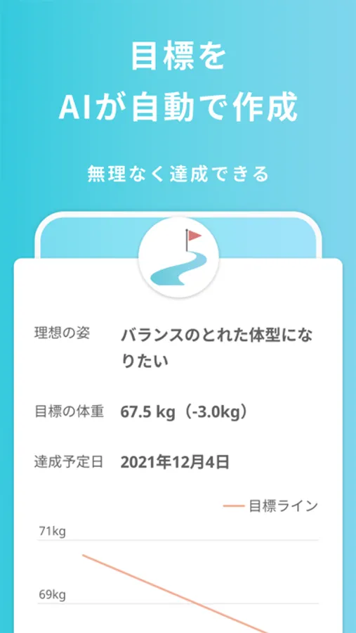 ・現在の身長・体重入力後、生活習慣や目標体重・なりたい姿などの質問に答えていくと、目標達成までの期間と一日の調整カロリーを自動計算。無理のないあなただけの目標を作成できます。