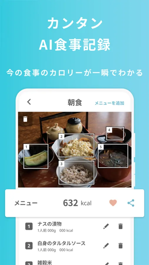 ・スマホで食事を撮影、または食事内容を検索して入力するだけで、カロリーや栄養素が一目瞭然!個別の食事アドバイスも届きます。
