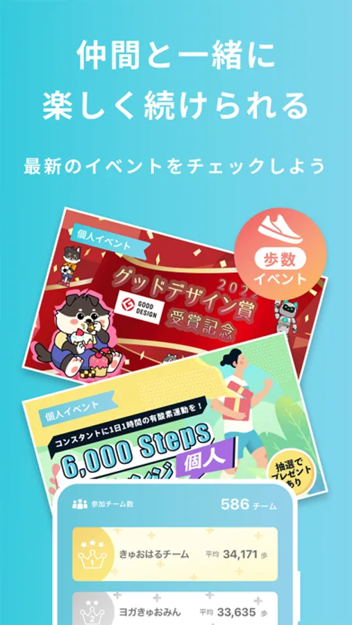 ・団体ごとの歩数イベントを作って、仲間と一緒に参加しよう!仲間とチームを作って参加できるので、やる気もアップ