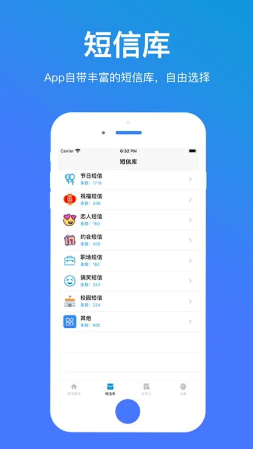 【短信群发 - 专业祝福群发助手】还能为用户提供2022年一整年100多个节假日,1000多条短信群发模板,及完善的节假日提醒短信群发功能,以此极大满足用户对节假日群发祝福的需求,从此不用为短信群发日期,内容而烦恼,不再错过任何一个节假日的祝福,只需拿起手机找到模板复制粘贴,一键群发,操作简单,高效便捷!