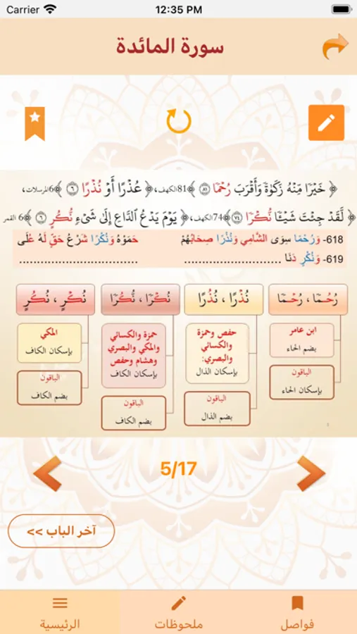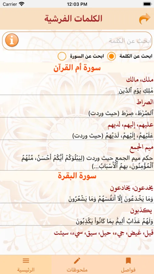 - الانتقال إلى تفصيل قراءة الكلمات الفرشية مباشرة من خلال هذه القائمة عبر الضغط على الكلمة.
