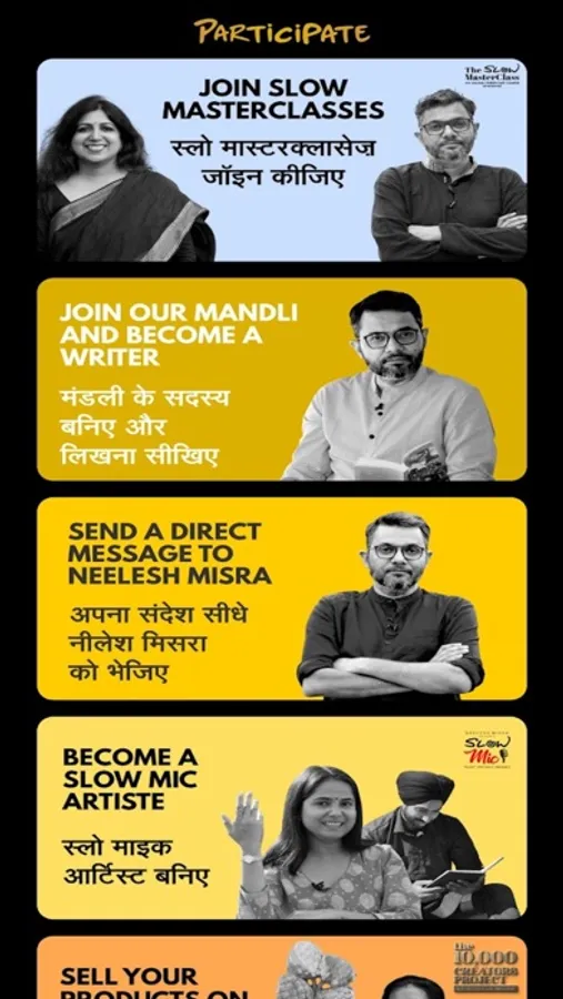 The app is the online platform of The Slow Movement, a community founded by India’s most loved storyteller Neelesh Misra. Slow is an effort to reconnect with ourselves and the beautiful small joys and experiences that we leave behind in our fast-paced lives. These could be about consuming the kind of laid back video/audio/text content we don’t often get to see in a clickbait world; sensory experiences that could range from a photo walk to birdwatching to a storytelling session to a pottery class; and products and things that reflect this thinking — that are pure (not laced with dangerous chemicals), connected to our roots, imbibed with honesty and giving back to the creators and not the middlemen.