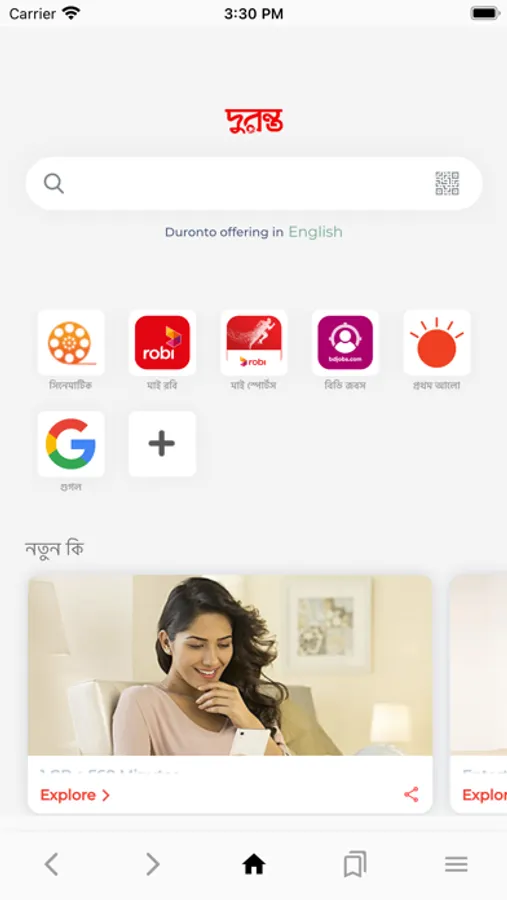 Duronto a Bengali browser with built in Package of Entertainment, News & Others services. It will change the entire experience of internet browsing. Users will enjoy Movie, Drama, Sports, News and more while browsing the Internet.