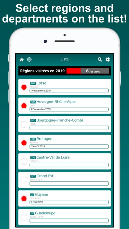 Select the regions and departments you want to mark on the list. In multiple color mode, regions and departments can be painted in different colors for each category. You can save brief notes for each region and department.