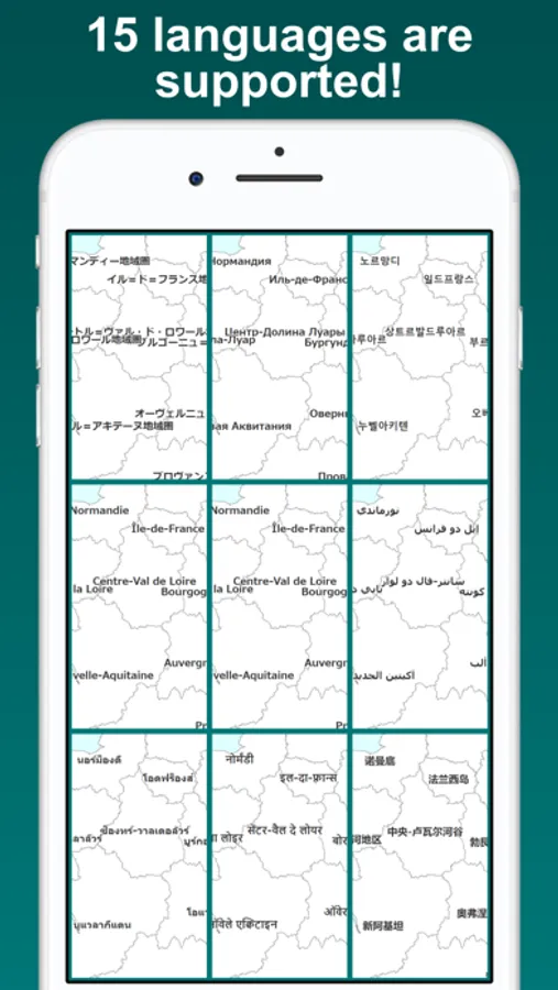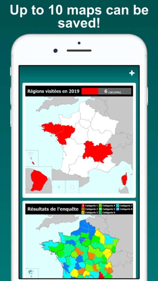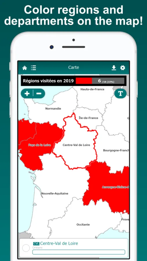 Visualize the regions and departments you have visited on the France map. Tapping a region or a department on the map, you can edit its color and note. By displaying the labels, you can easily locate regions and departments on the map. The map can be zoomed in and out.