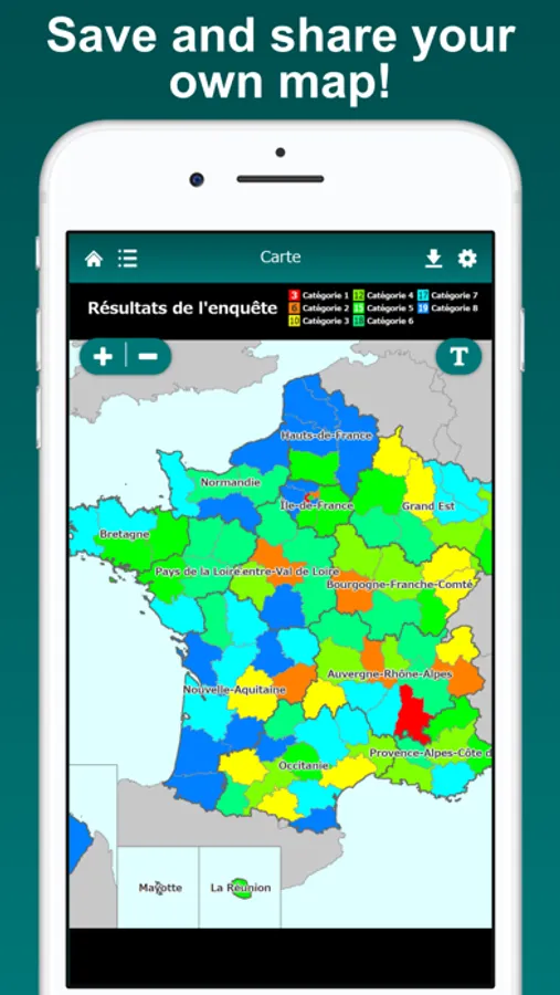 The map can be saved as a image in the device and shared through various social media, such as Instagram, Twitter, Facebook and LINE. You can also export data with region and department codes in CSV format that can be analyzed in Excel or GIS.