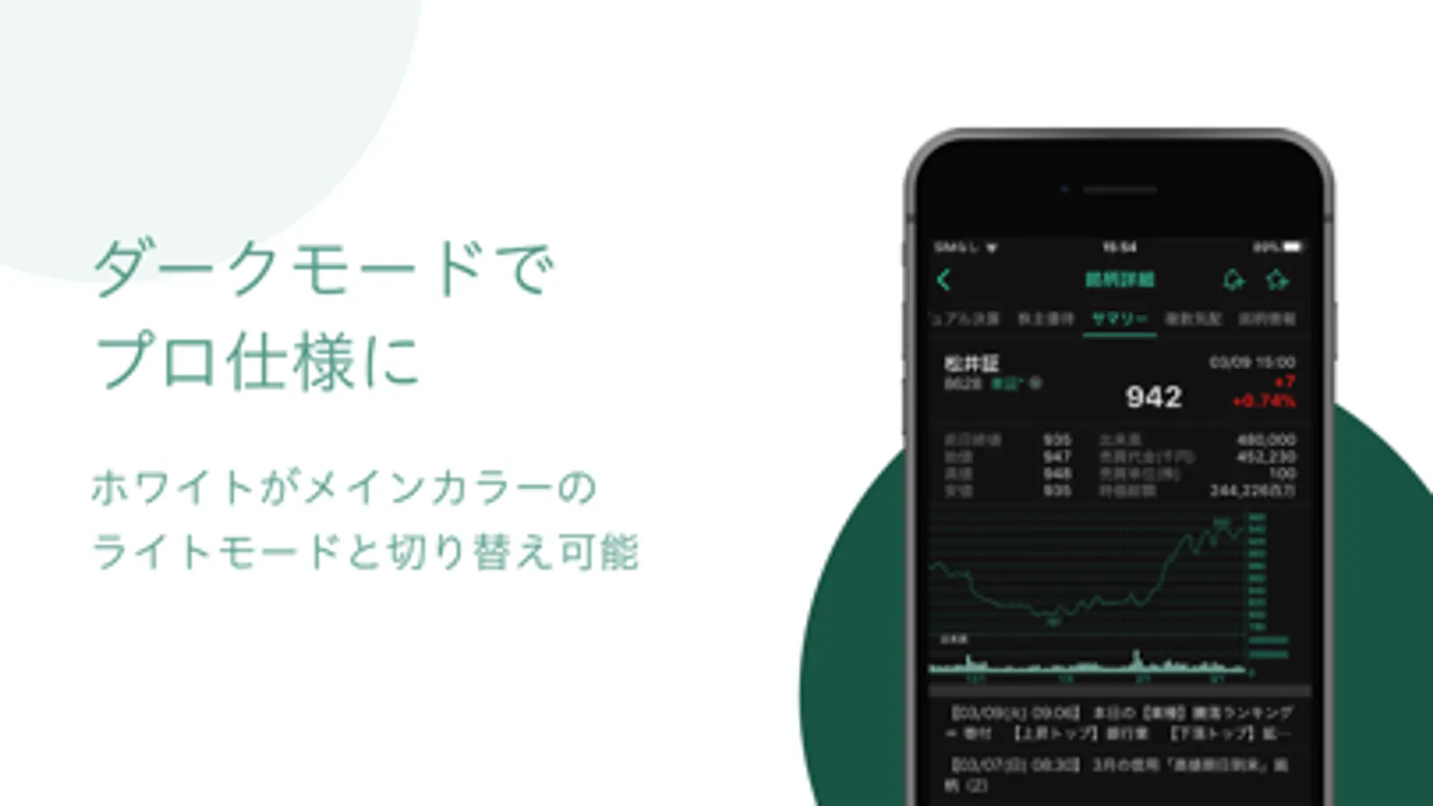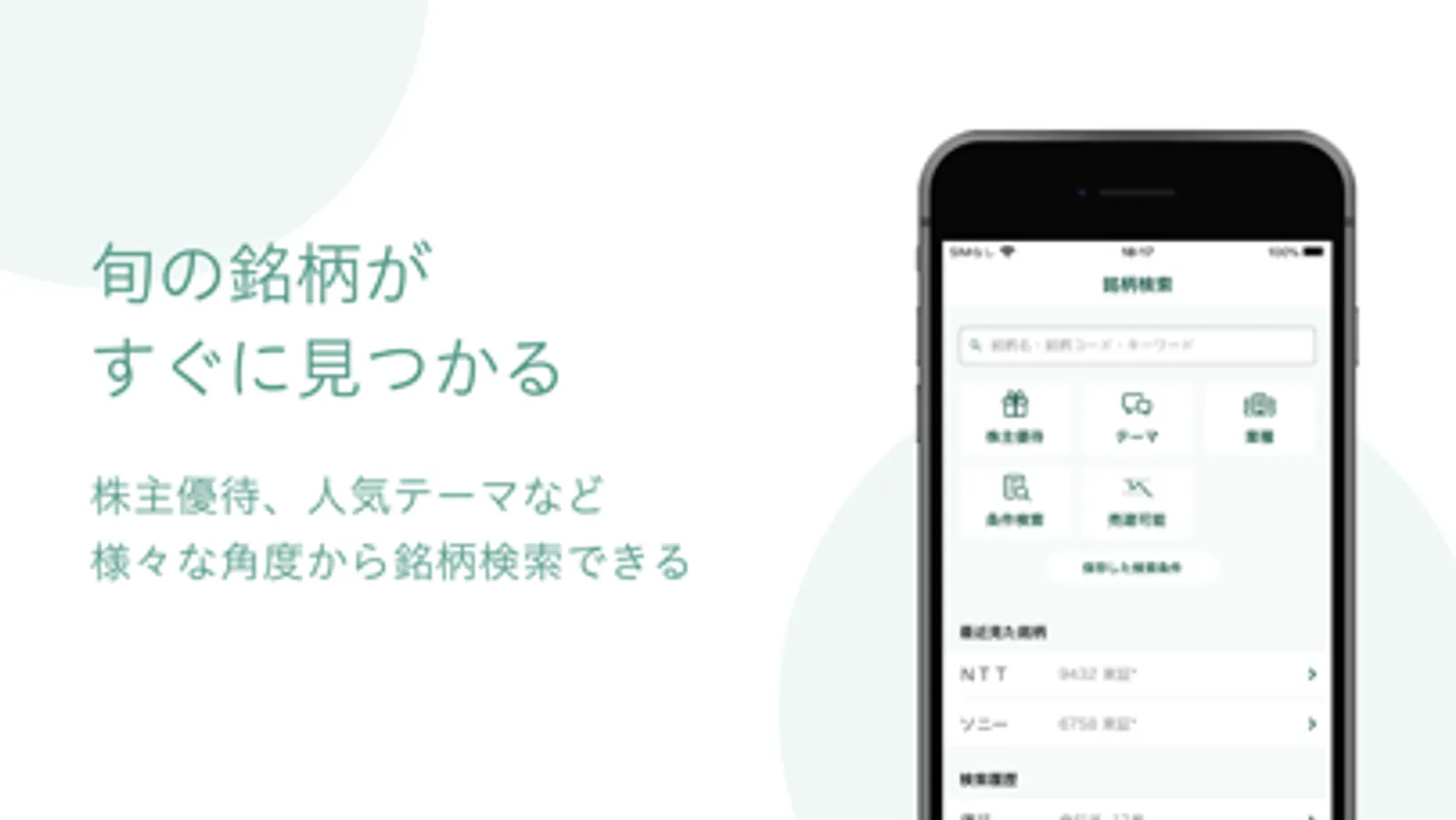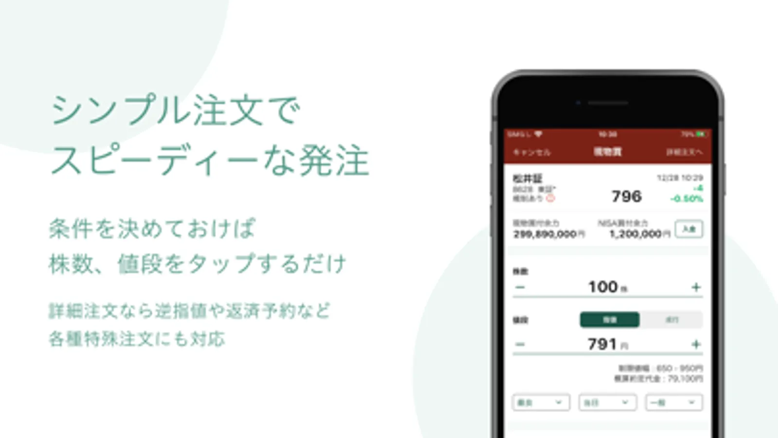 シンプルな画面で、情報検索から銘柄分析、発注までこれ1つで完結できるアプリです。