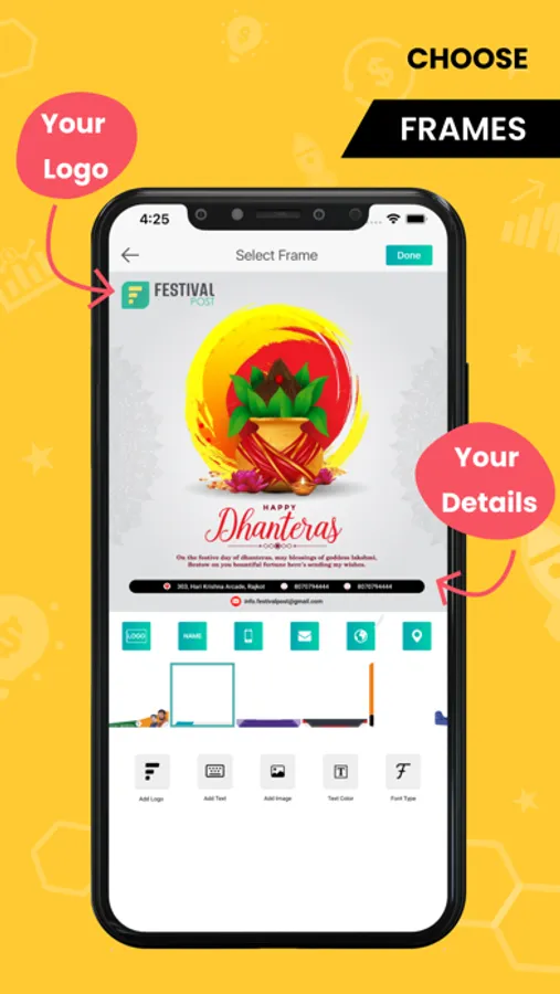 Using this business poster maker with name and icon you can simply upload your brand logo design and business card details like business name, business email, business phone, or mobile number then Festival Post - Photo Maker app will automatically add to the festival photo or poster and that’s it.
