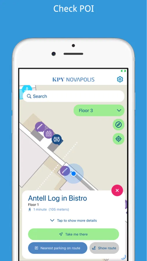 The application gives you detailed navigation instructions from your current location to the destination or to the right entrance. You can search for the route already from home, in which case the application will also show the car park closest to your destination.