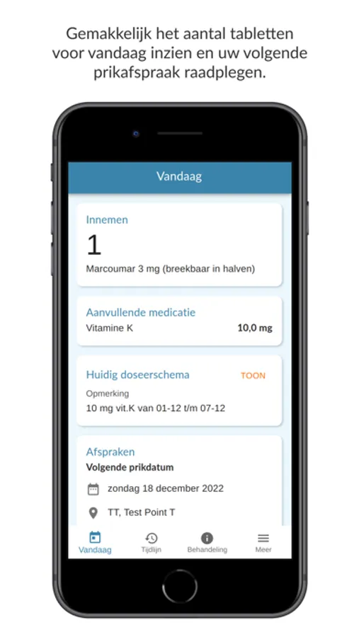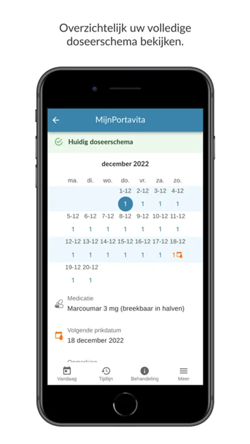 Met de MijnPortavita app heeft u snel inzage in uw antistollingsgegevens. Zie meteen het aantal tabletten dat u voor vandaag moet innemen en wat uw volgende prikdatum is.