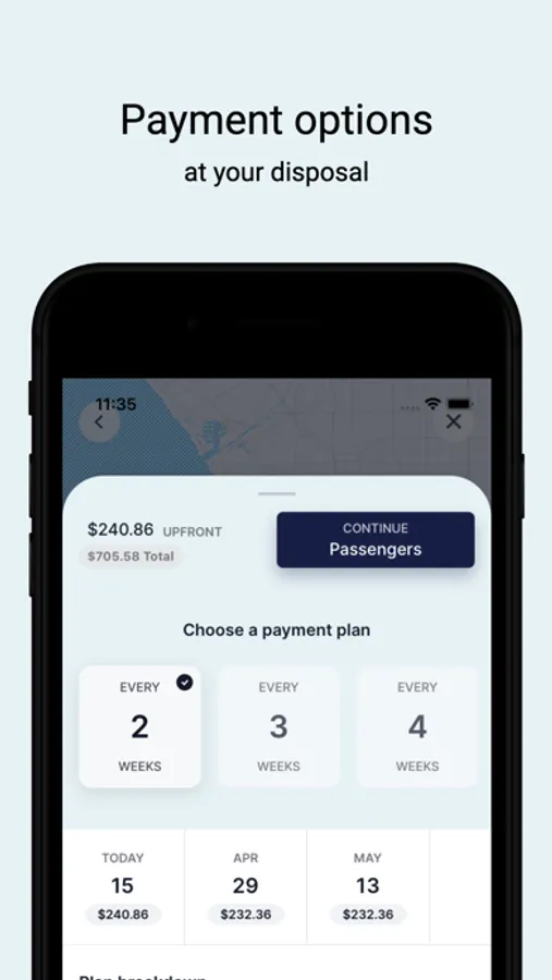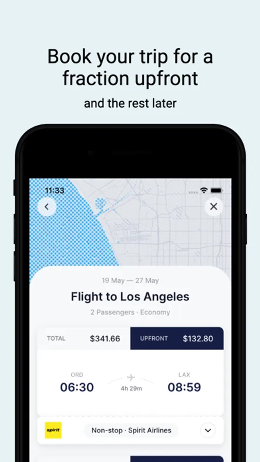 Book your flight for a fraction of the cost upfront and pay the remaining balance in installments before your departure date.