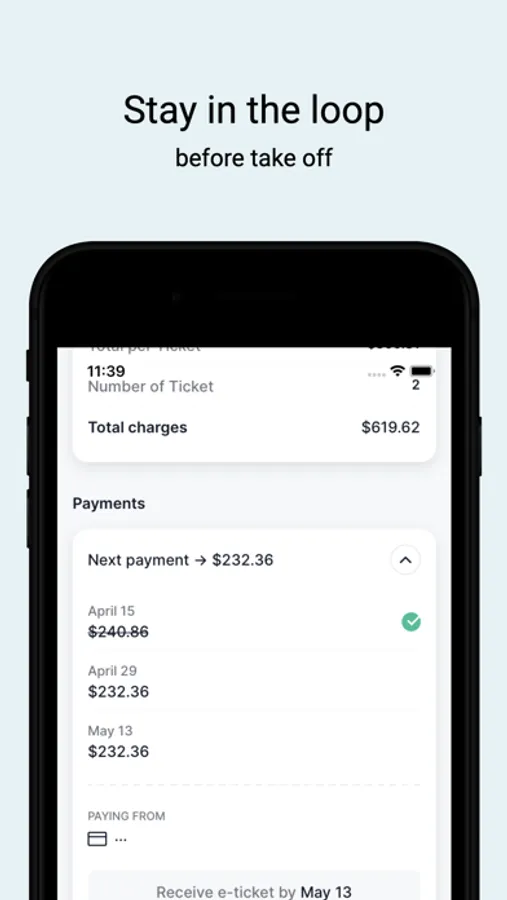 Pay only a fraction of the cost upfront for your flight. You're guaranteed to receive your confirmed e-ticket once you've paid your final installment. No gimmicks. No hassle. Just accessible travel for your needs.