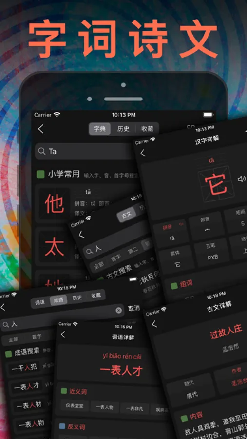 3、汉语字典、拼音、笔画、边旁部首搜索功能;