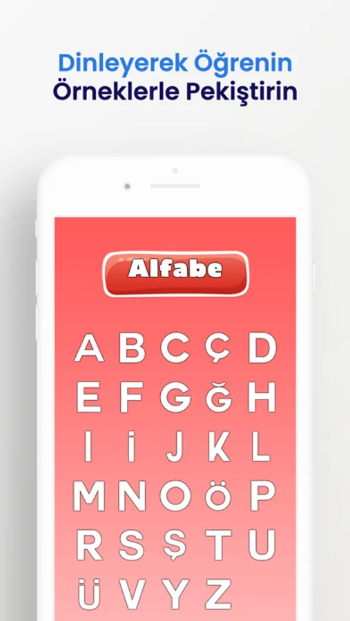 A , B , C , Ç , D , E , F , G , Ğ , H , I , İ , J , K , L , M , N , O , Ö , P , R , S , Ş , T , U , Ü , V , Y ,Z sesli ve görsel destekli öğrenecekler.