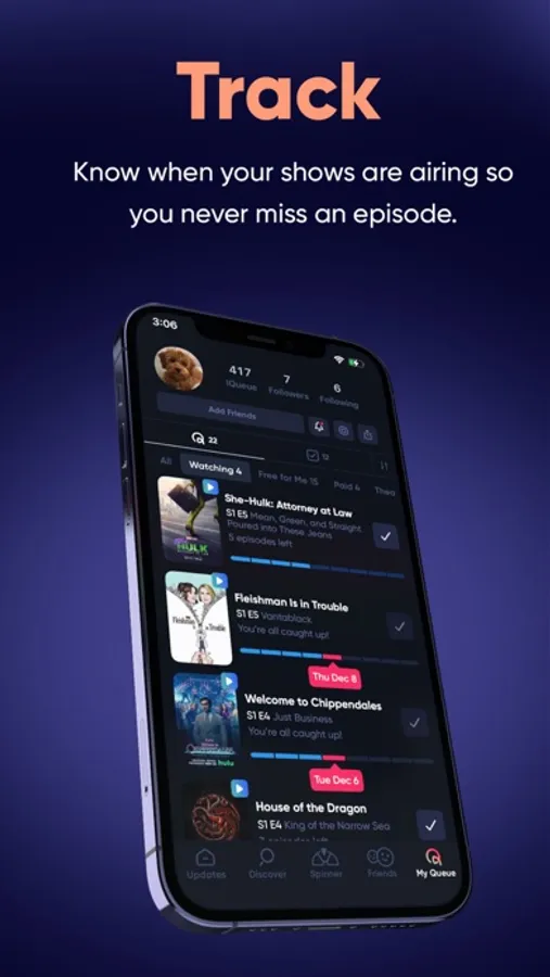 Queue is the easiest and most fun way to track your movies and shows, discover new things to watch, and share what you're watching with your friends.