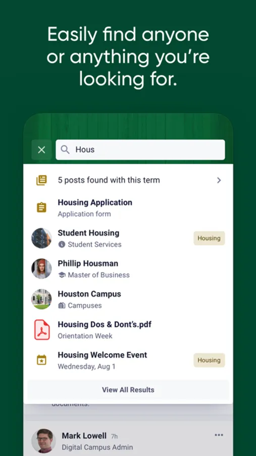 - Search staff, peers, systems, groups, posts, resources and more