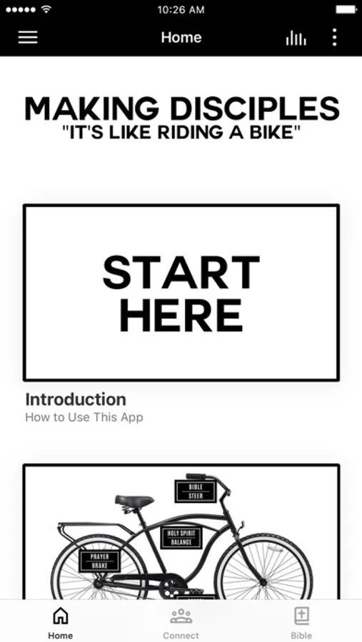 This App is designed as a discipleship tool for one-on-one discipleship or a small group. It covers the core 4 fundamentals to following Jesus and living out the great commandment and great commission (Love God, love people, and make disciples). In order to ride a bike you have to pedal, balance, steer and brake. These are required if you're ever going to ride. Discipleship has 4 requirement as well; The Gospel, the Holy Spirit, the Bible, and Prayer. You have to know, experience and be able to teach these core 4 fundamentals if you're going to make disciples. It's simple! Once you get it, something clicks and you'll forever be confident and competent. "It's like riding a bike".