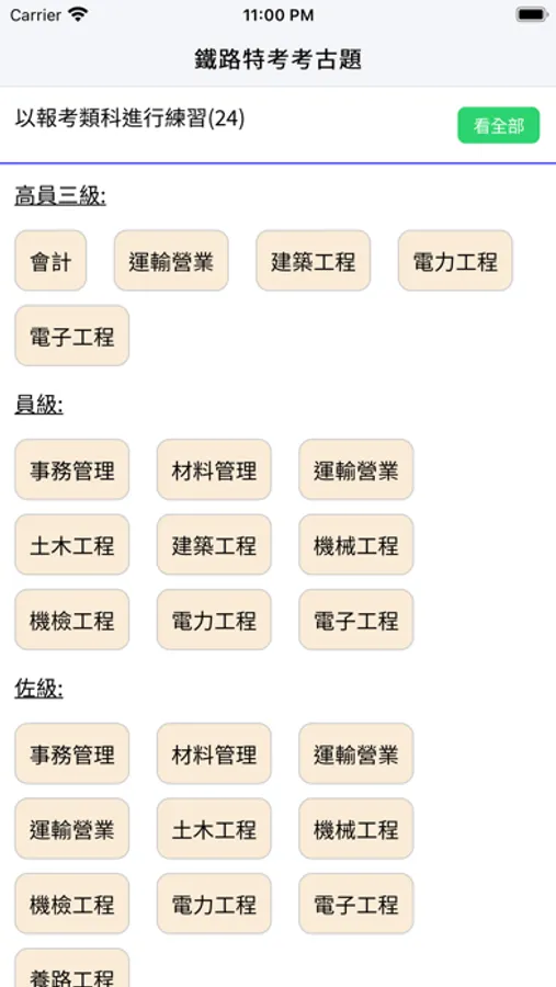 機械工程、機檢工程、電力工程、電子工程、電信工程、資訊處理、養路工程、土木工程、建築工程、都市計畫技術