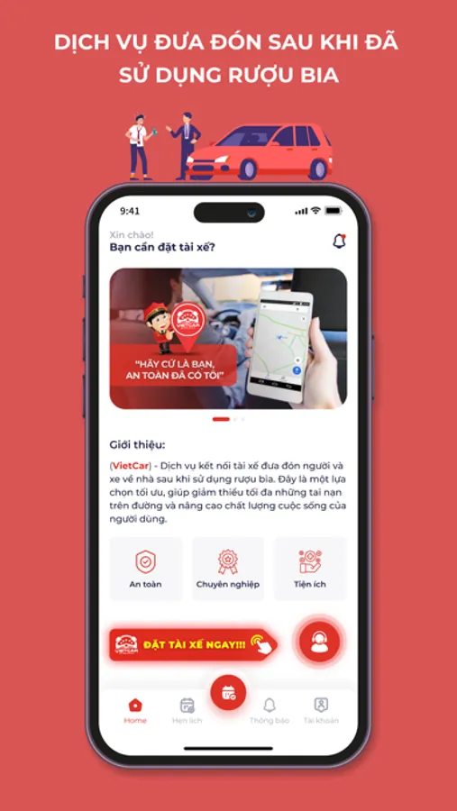 VietCar - Dịch vụ kết nối tài xế đưa đón người và xe về nhà sau khi uống rượu bia. VietCar là một lựa chọn tối ưu, giúp giảm thiểu tối đa những tai nạn trên đường và nâng cao chất lượng cuộc sống của người dùng.