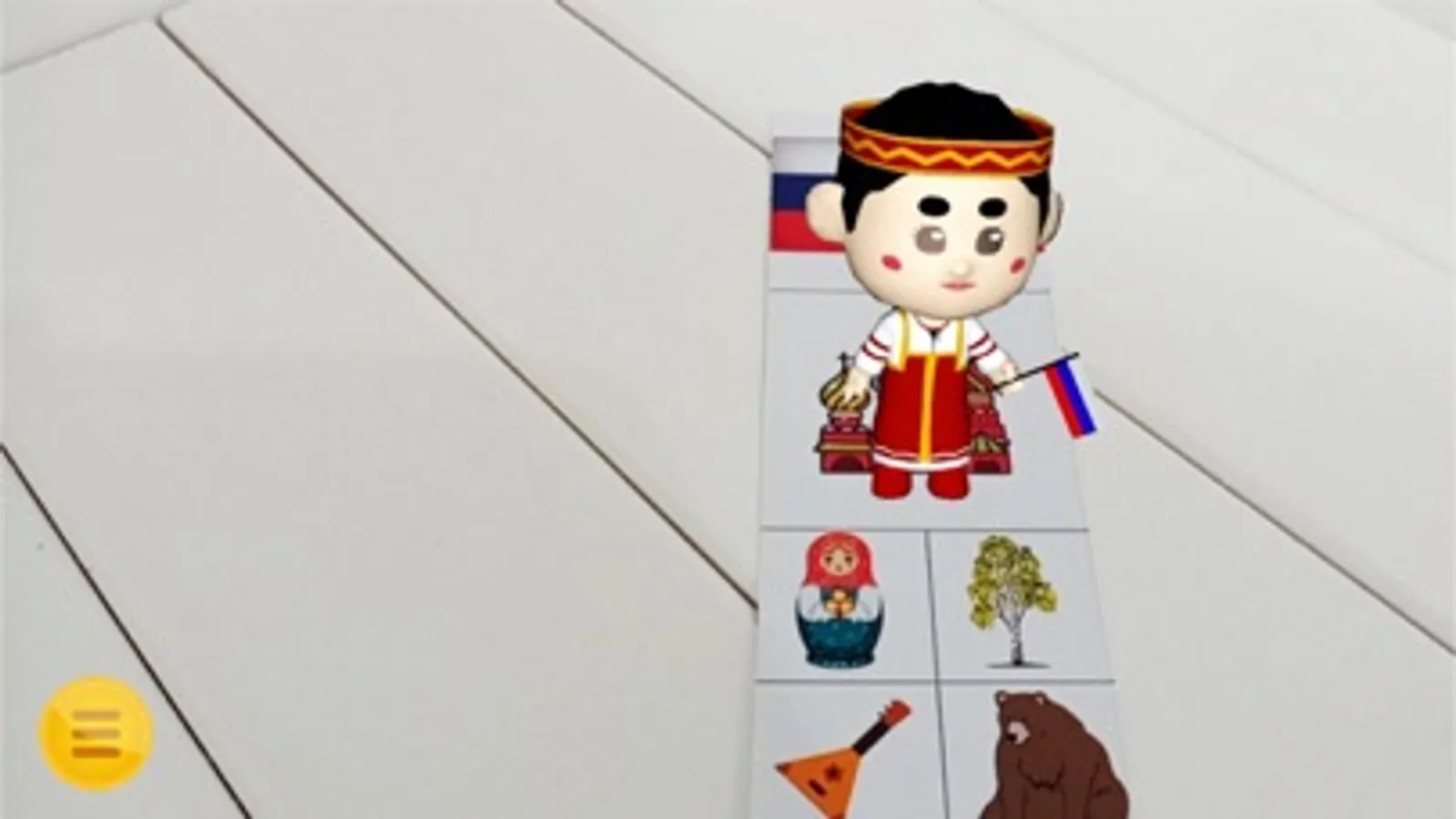 Point the camera of a smartphone/tablet at the card, a representative of this country will appear on the screen and tell about its traditions and customs. Assemble a representative of this nationality from the cubes. National costumes on the cubes and on the gadget screen should match!