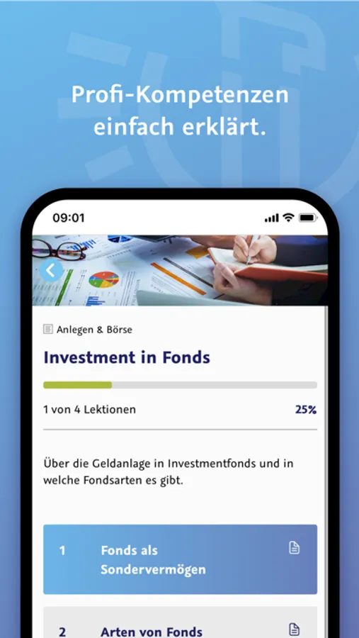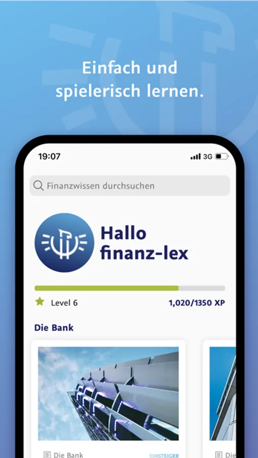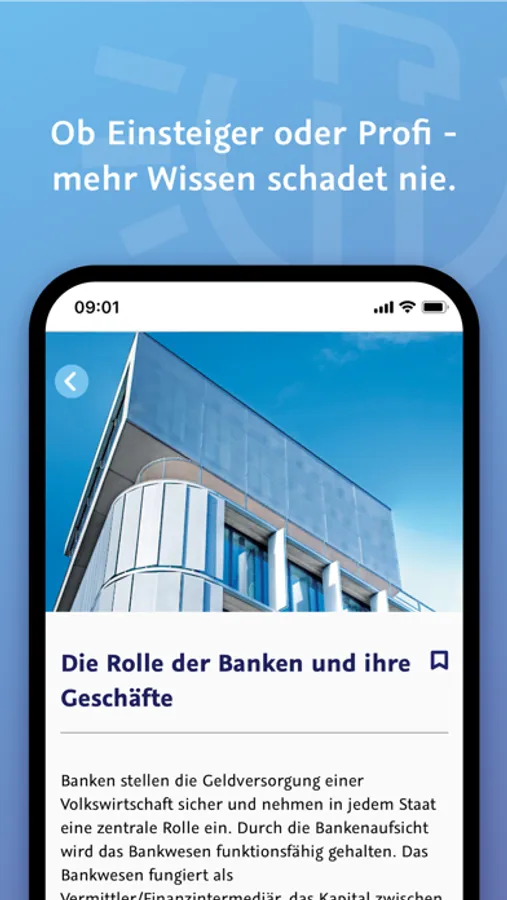 Die App bietet Ihnen aber auch einen Mehrwert – für die, die bereits fest mit beiden Beinen im Finanzleben stehen und noch tiefer in die Welt des Bankwesens eintauchen wollen. Detailliert beschriebene Kapitel und Erklärvideos vermitteln Ihnen dabei wertvolles Wissen, durch welches Sie auf spielerische Weise vom Einsteiger zum Anlage-, Aktien- oder Investmentprofi werden. Neben Themen zu aktuellen Finanzierungsmöglichkeiten beschäftigt sich die App aber auch mit Ihrer Zukunft und klärt Fragen zur besten Vorsorge Ihrer Pension.