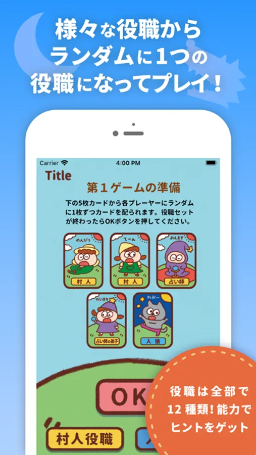 ゲームに使う5枚のカードには12種類から役職を選んでセットできます。なかには能力を持った役職があり、相手が「村人チーム」なのか「人狼チーム」なのかを推理するためのヒントを得ることができます。