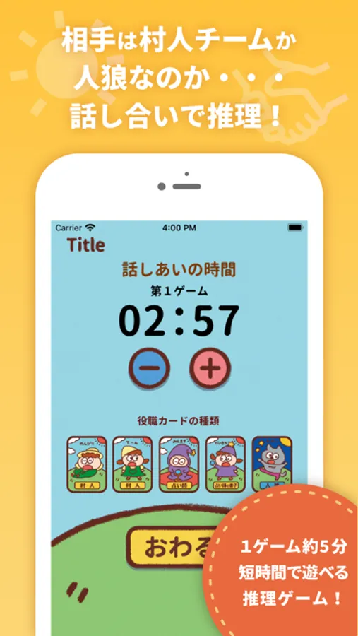 プレイヤーは5枚カードの中からランダムに決定した1つの役職になり、「村人チーム」か「人狼チーム」に分かれて、相手に自分が「村人チーム」だと信じてもらえるよう話し合いを行います。