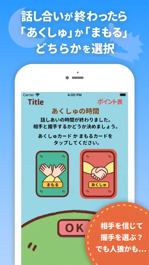 でももし、一方が人狼なのにお互いに握手をしてしまったら、人狼だけのポイントに・・・。