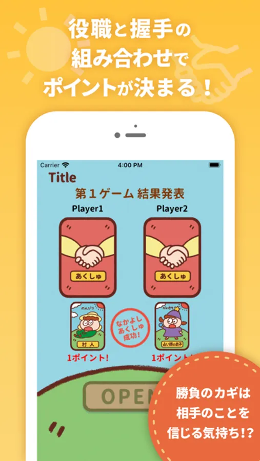 プレイヤーが2人とも村人チームの役職同士ならお互いに握手を選ぶことでポイントゲットです!
