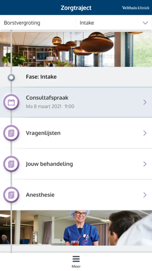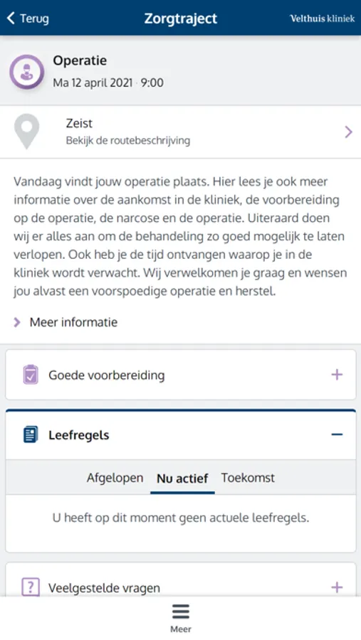 Mijn Velthuis kliniek geeft u de juiste informatie op het juiste moment over uw behandeltraject. In de app vindt u alle informatie over uw (behandel)afspraken, de voorbereidingen voor uw behandeling, leefregels en veelgestelde vragen.Door een koppeling met het Elektronisch Patiënten Dossier is de informatie altijd actueel, specifiek en relevant voor u. De informatie in de app is afkomstig van Velthuis kliniek.