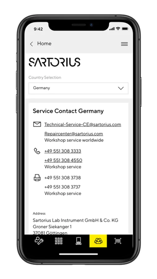 You can find all the necessary contact details for your Sartorius service directly in the app. During working hours, no matter if your question is technical or another issue, the telephone number is there ready to dial. Sartorius is always happy to help you.