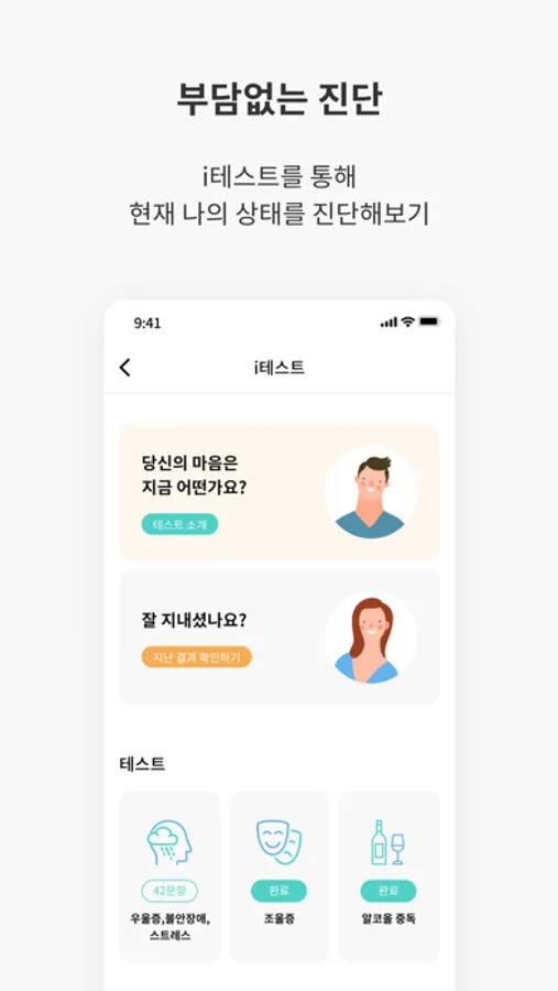 사용자들은 기댑에서 제공되는 itest(자기 정신건강 테스트) 통해서 자신이 어떤 문제가 있는지를 쉽게 파악할 수 있고, 공신력 있는 테스트 결과 및 분석을 즉시 제공받게 됩니다.