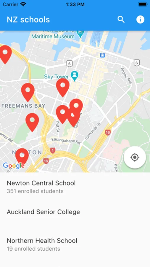The app provides information about New Zealand schools, including their contact details and institutional information. This includes state and private schools.