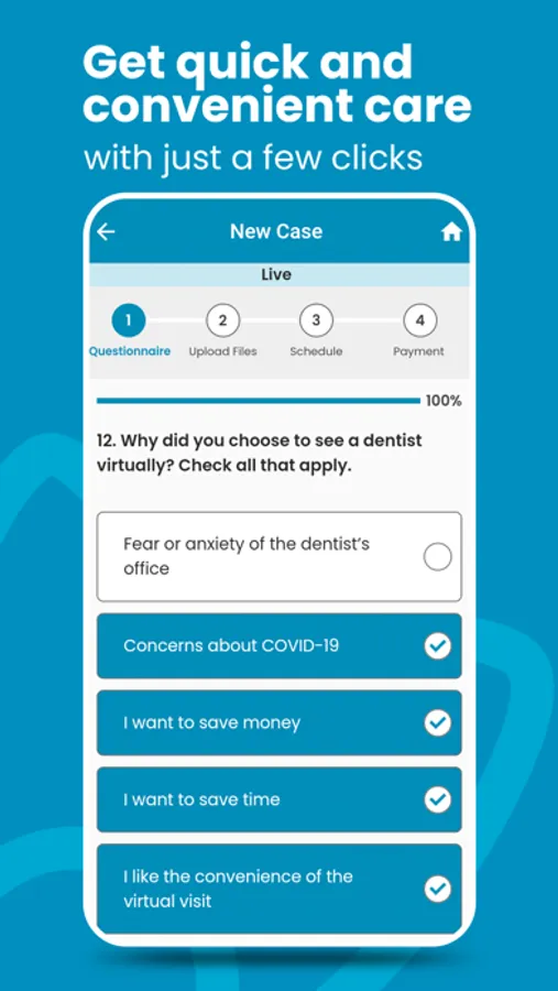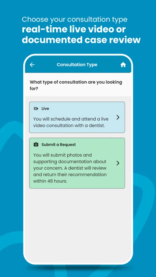 3. Choose how you want to communicate with your board-certified digital dentist. Either schedule a virtual dentist visit with our in-app video chat, or upload photos or documents for a dentist to review off-line. No matter which option you choose, you’ll be able to ask more questions and get answers right within the app!