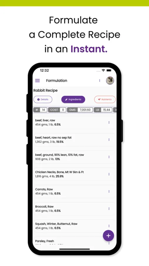 Animal Diet Formulator (ADF) takes the guesswork out of creating fresh, biologically appropriate, pet food with our user-friendly formulation software. Our software helps manage risks in formulating quality, complete, and balanced pet food recipes - safely, efficiently, and within budget.