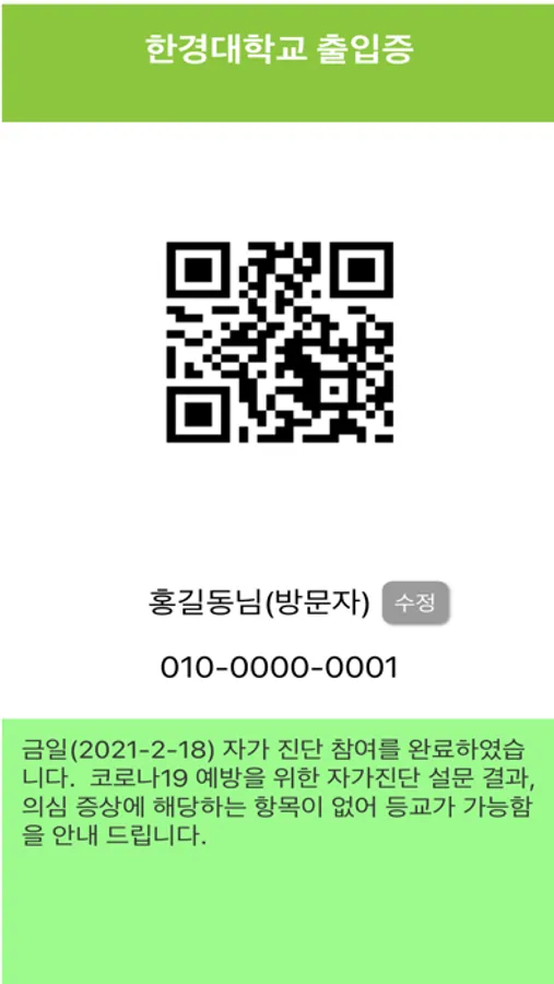 자가진단을 완료하면 QR코드가 생성됩니다. 생성된 QR코드는 24시간 동안 유효하며 24시간이 지나면 자가진단을 통해 다시 QR코드를 생성하게 됩니다.