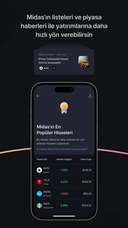 Kullanıcı dostu arayüzü ile Midas’ta hisse alım-satım işlemleri çok kolay! Midas uygulamasındaki Borsa İstanbul ve Amerikan borsalarına dair güncel içerikleri ve uzman hisse listelerini takip ederek yatırımlarına kolayca yön verebilirsin.