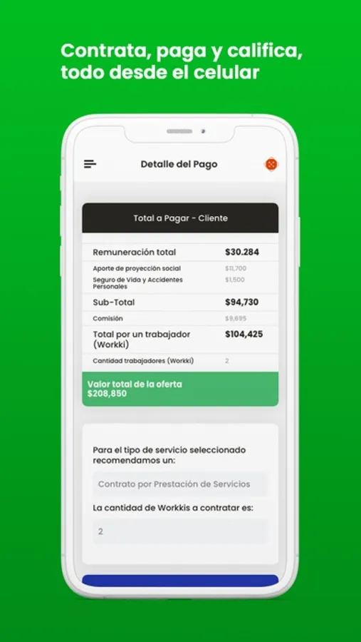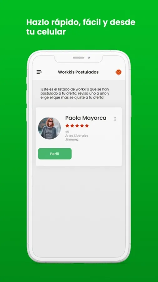 workki es una plataforma tecnológica que permite a nuestros clientes conectar con personas que previamente se han registrado y a quienes se les ha realizado un proceso de validación, nuestro algoritmo ejecuta el proceso de “match” para hallar la conexión ideal! Acompañamos tanto a las personas como a los clientes, en el proceso de principio a fin: Ofertar, Elegir, Contratar, Pagar y Calificar, para que el trabajo se ejecute satisfactoriamente. Todo a al alcance de tu mano, fácil y sin complicaciones.