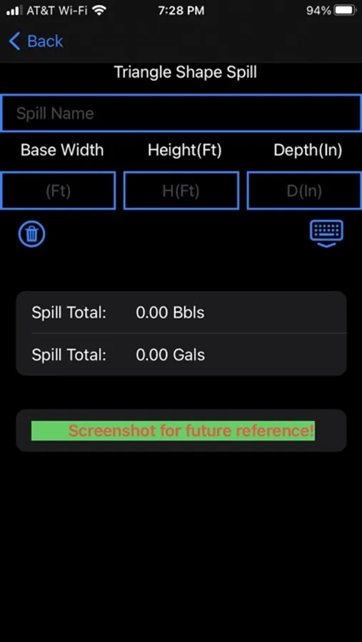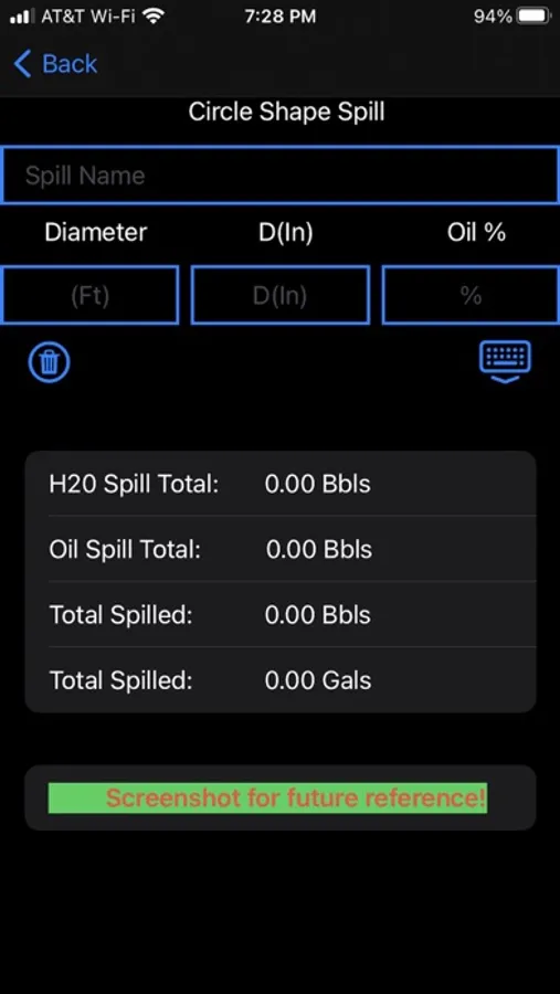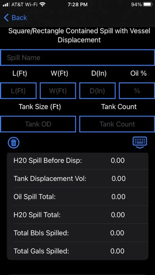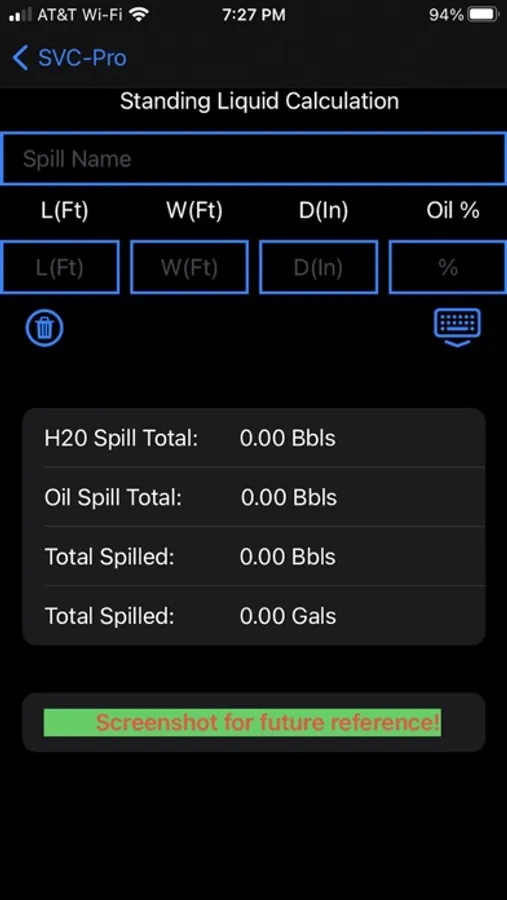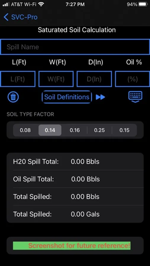 NEW!: Calculate spilled fluids on different soil types, and account for the soil displacement. NEW!: Name your spill, and screenshot your results to be able to reference at a later time, email, or airdrop if you would like to share. NEW!: You can now account for two separate fluids in one calculation (e.g. oil and water). All of the available calculations from our original "Spill Volume Calculator" have been incorporated into this app as well.